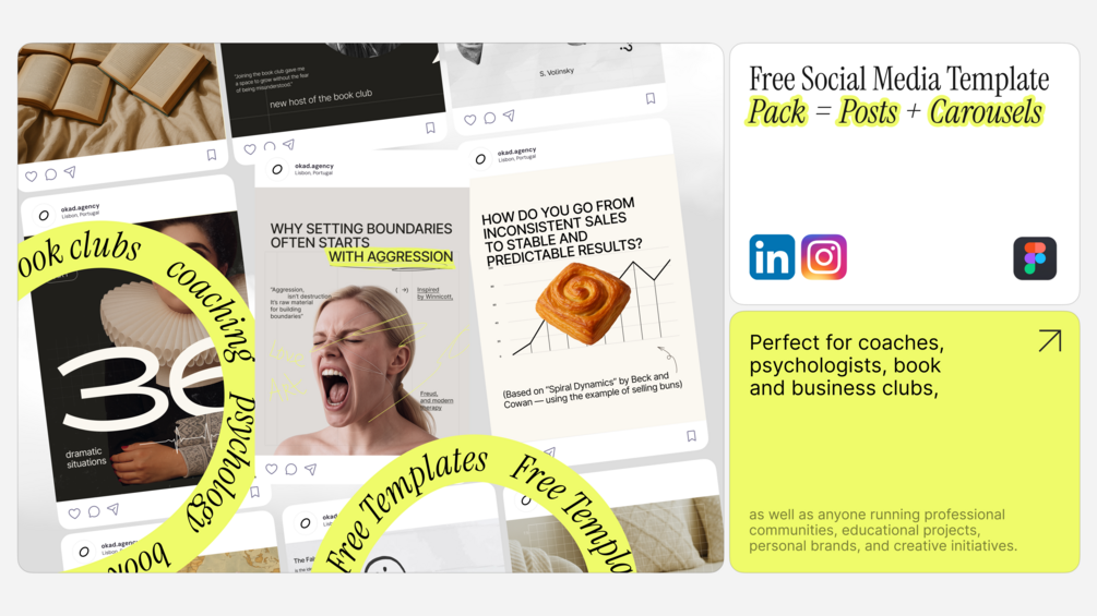 80 editable social media templates for coaches, educators, and community brands. Includes carousels, quotes, testimonials, announcements and more — optimized for Figma.